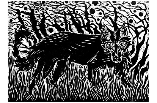 Her work depicts the wilder, darker side of Cornish nature. Each print is paired with a fragment of poetry that brings out the essence of the image. The scenes have a touch of old fashioned fairytales about them, reflecting the opposing curves and angles of the natural and industrial landscapes and wild seascapes of the south west. Animals run free in their natural environment and the prints embody the strength of the southwesterly winds that shape the character of the land and sea. More stylised prints use shape and pattern to interpret both natural and manmade forms with a structural grace and balance.
