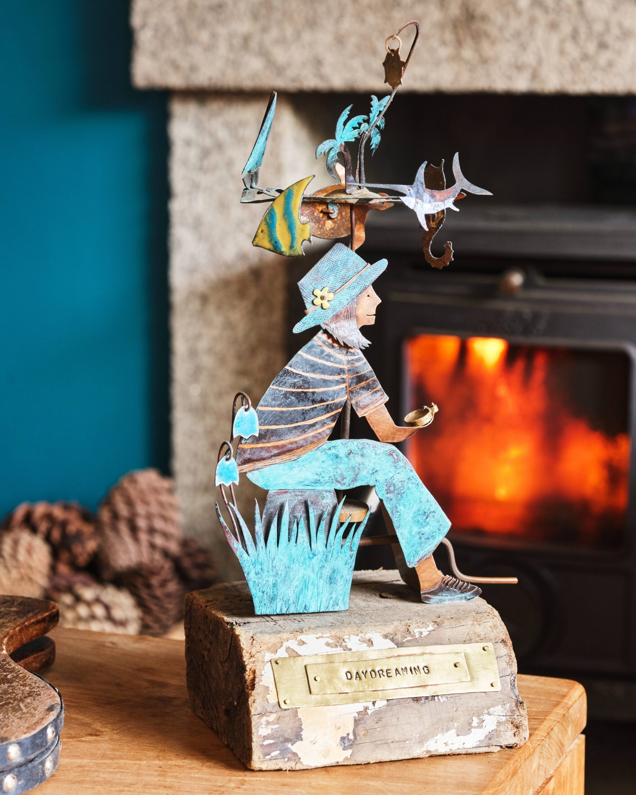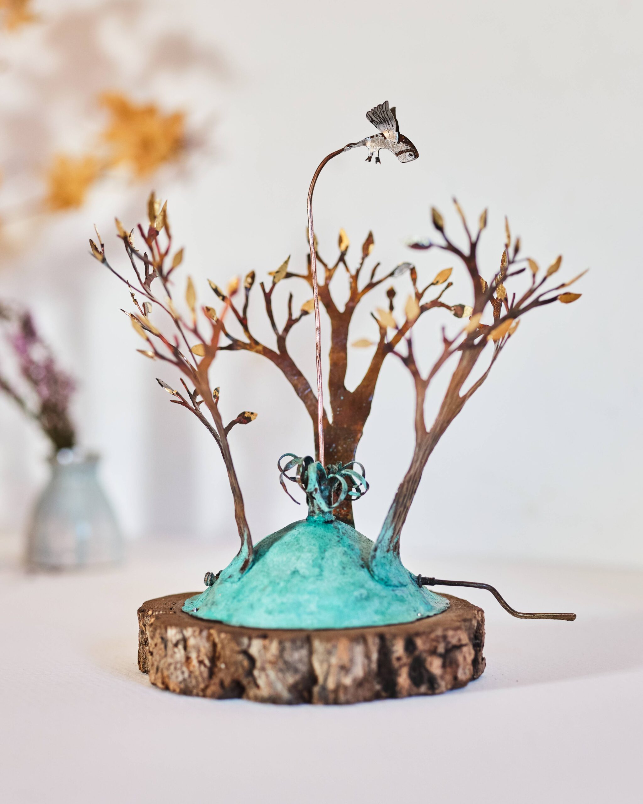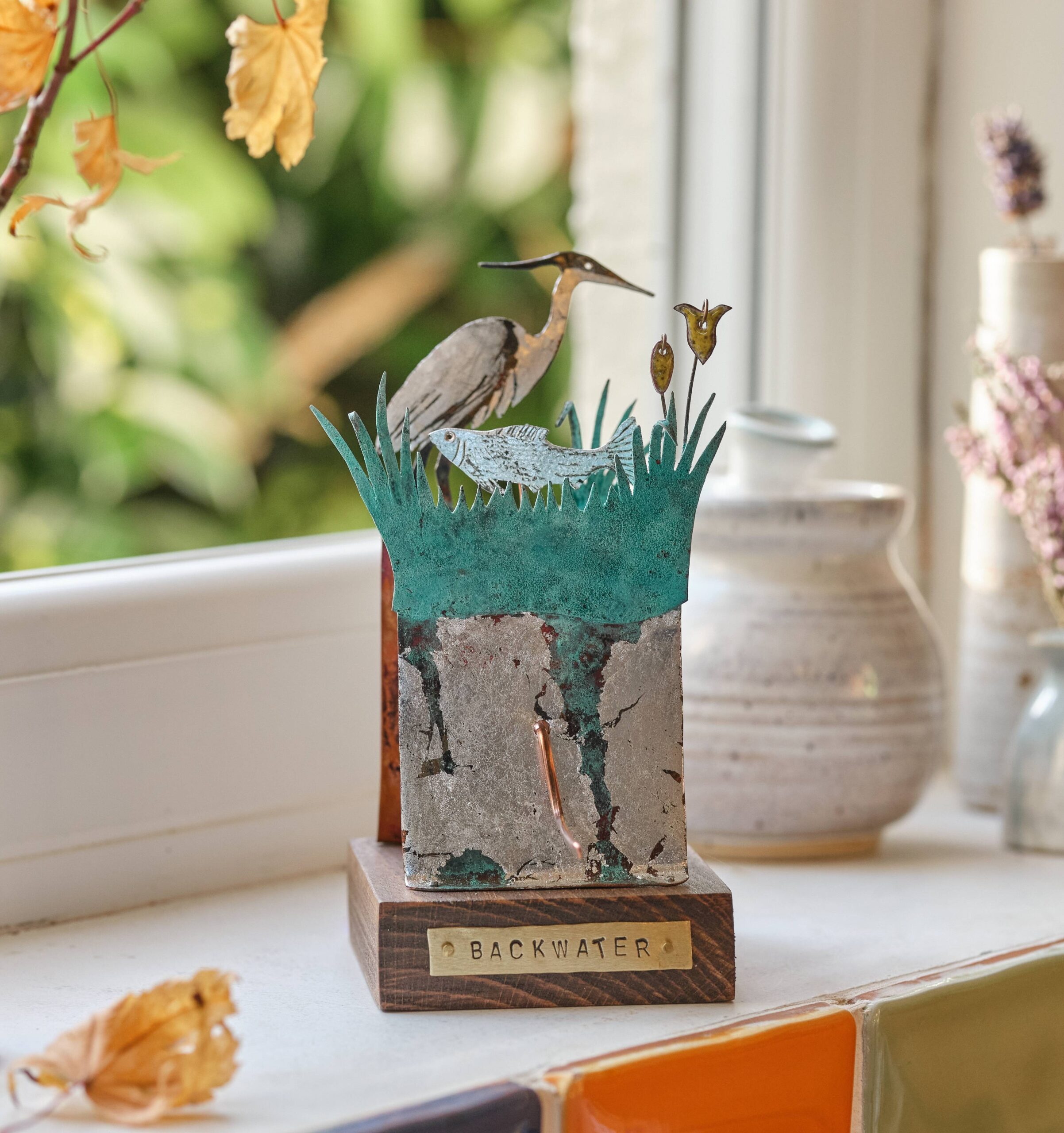 The work is made in copper, brass, nickel and silver to which I add highlights of enamel, brightly coloured recycled tin or leaf metal. Colour is also applied directly to the metal through a process of patination which involves applying layers of copper nitrate and burning reds and browns into the copper. Each piece sits on a base of either reclaimed hardwood or found driftwood.