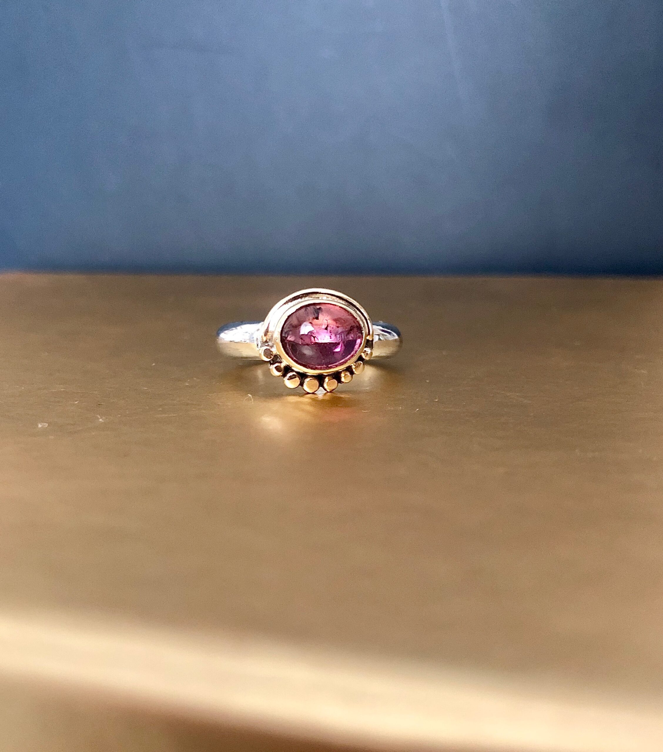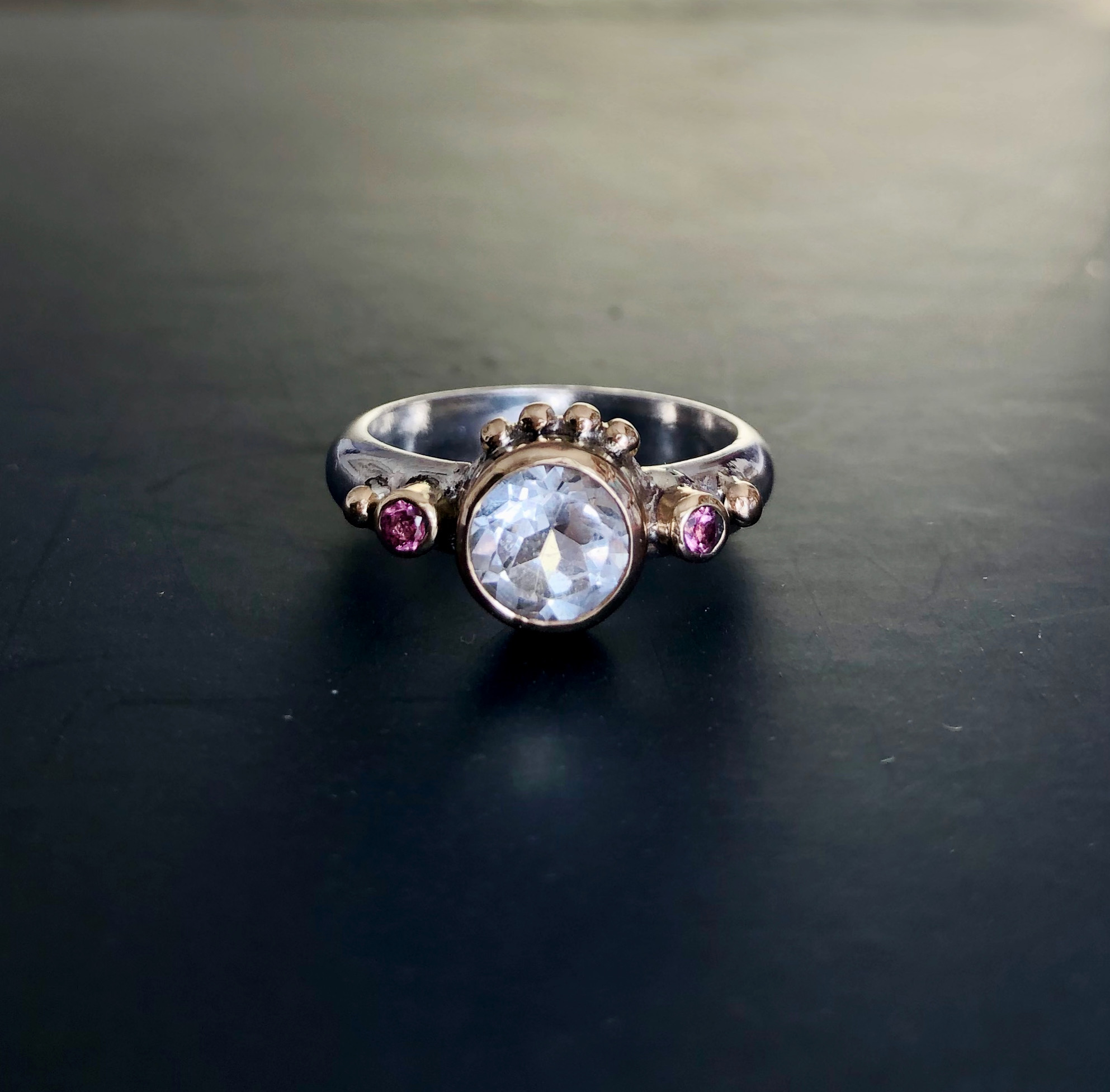 white topaz, pink tourmaline, 9ct gold and silver ring