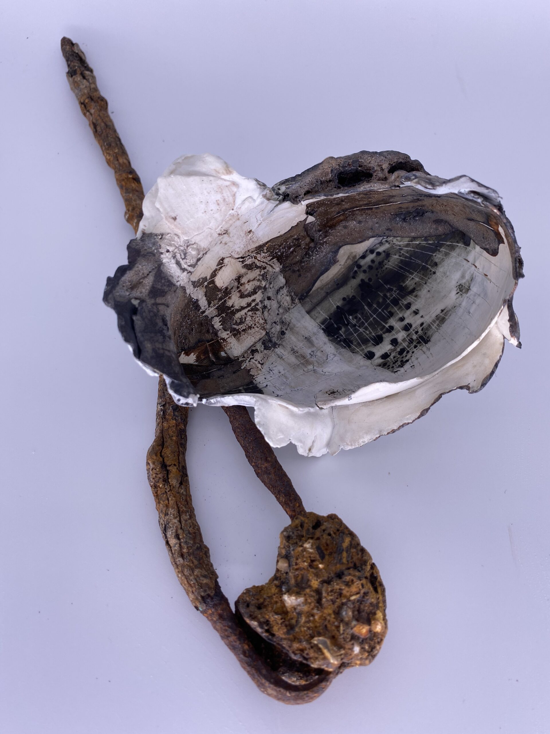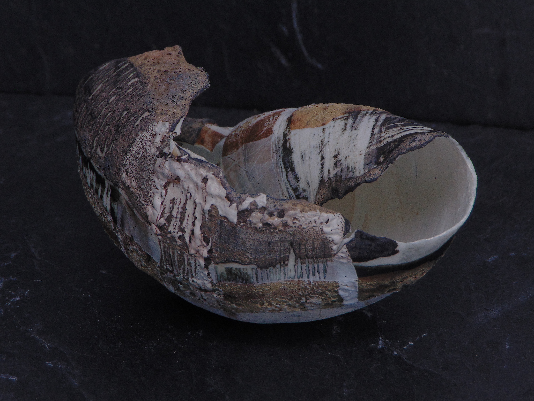 I love the sculptural challenge of combining found industrial and organic objects with hand built ceramics. Predominantly large in scale, my work can often sit either on the body, a table or a wall. Along with this I have finally once more connected with my painting practice, only now upon a three dimensional surface.