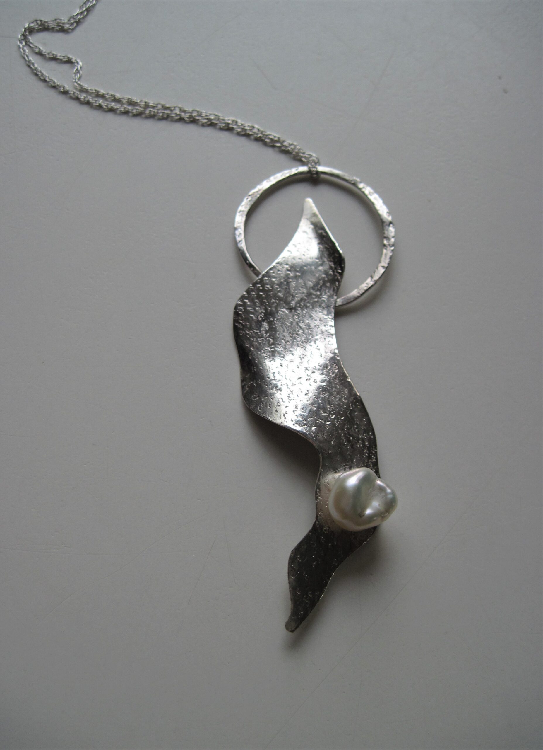 Pendant made with textured sterling silver and one white freshwater pearl.
