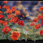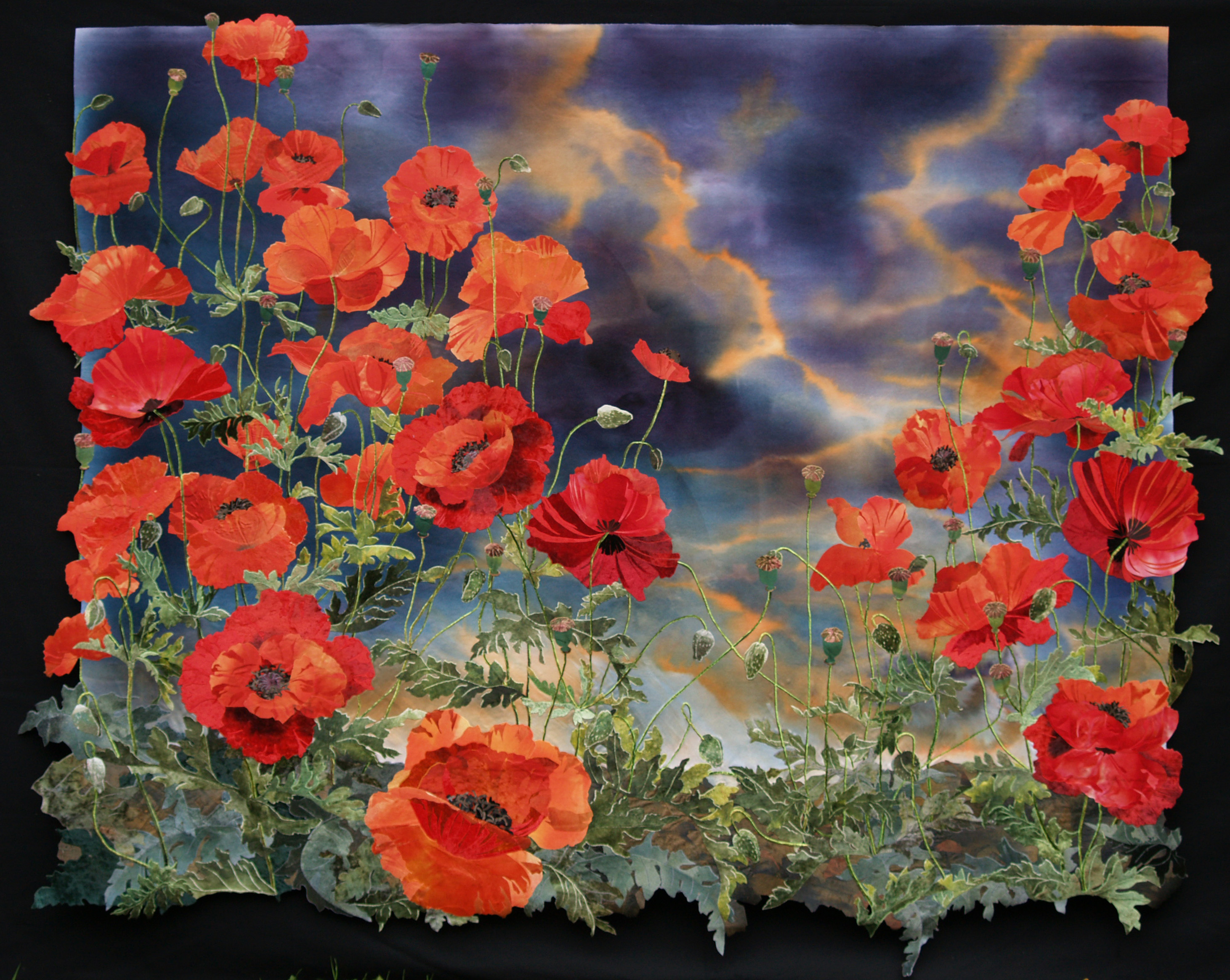 In this artwork the ephemeral, blood red poppies reach up towards that warring sky, brilliantly illuminated, easily crushed, and yet returning again and again despite the carnage.