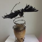 The headpiece, constructed of rusted barbed wire, rolled between the opposing armies and here supports a carrion crow beaking a band of gold from No Man’s Land.