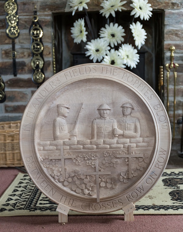 The first piece, ‘The Plate of Remembrance’, made of Sycamore, roughly  51cm in diameter, depicts a trench with three soldiers protected by sandbags in relief carving, seen through a ‘pierced’ fence upon which crosses of remembrance (all hand carved) have been placed. The familiar words ‘Lest We Forget’ from the poem ‘Recessional’ by Rudyard Kipling, are inscribed on the outer rim.