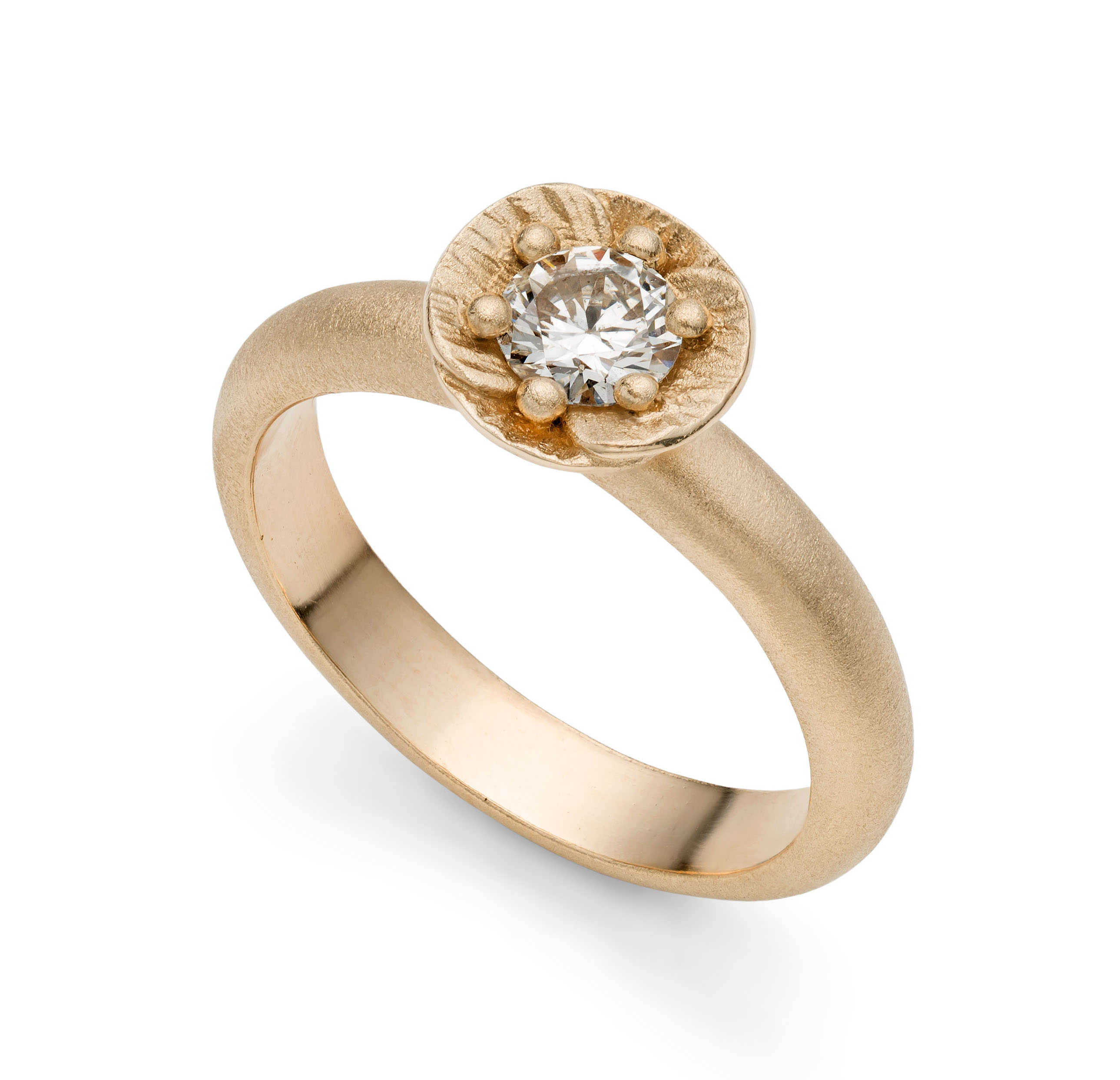 ‘My work is always botanical, and with an existing poppy collection, it seemed only right to follow the theme with this iconic flower, always synonymous with war and memories. In the war poem ‘In Flanders Fields’ by John McCrae, for me, the most poignant words are ‘We are the dead. Short days ago…We Loved and were loved’. This line speaks of the living, those who loved, those who are left with nothing but memories. The memories and stories of a lost loved one are the only part that can live on forever, through the living. And so I wanted these new Poppy pieces (usually based on the pod) to be based on the living flower. And of course, the only stone that lives forever, is a diamond.’